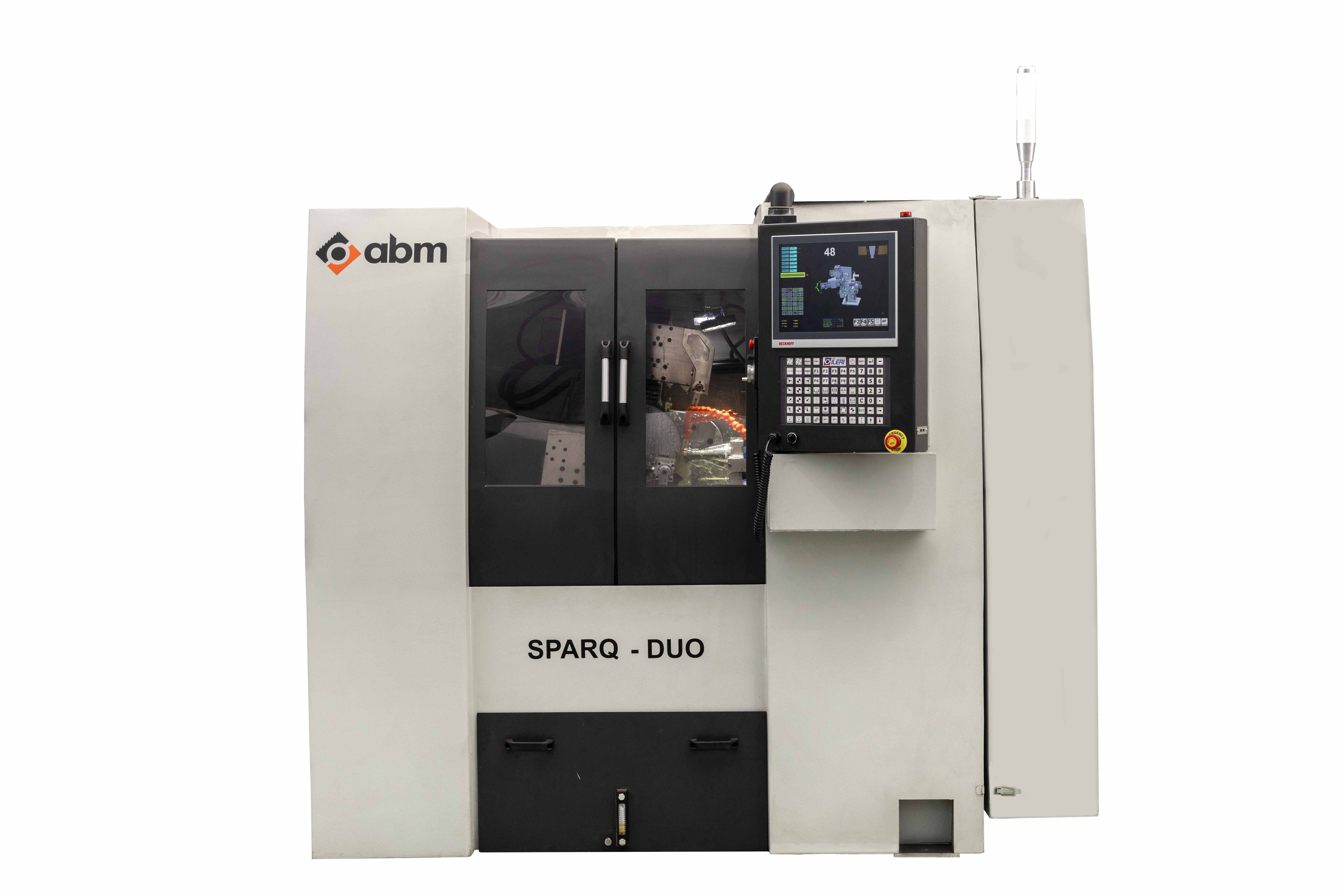 SPARQ DUO Double Side Erosion Machine 8-axes full CNC control. PCD Erosion for Circular Saw Sparq-Duo is an ideal machine for PCD circular saws grinding. Thanks to the CNC control, all desired geometry settings can be performed from panel. User-friendly interface and machine's ease of use minimizes the need for qualified operator.On the SPARQ-DUO, two horizonal grinding heads are adapted to our classical double side grinding machine, tangential and radial angles are automatically adjusted easily from the CNC control panel.